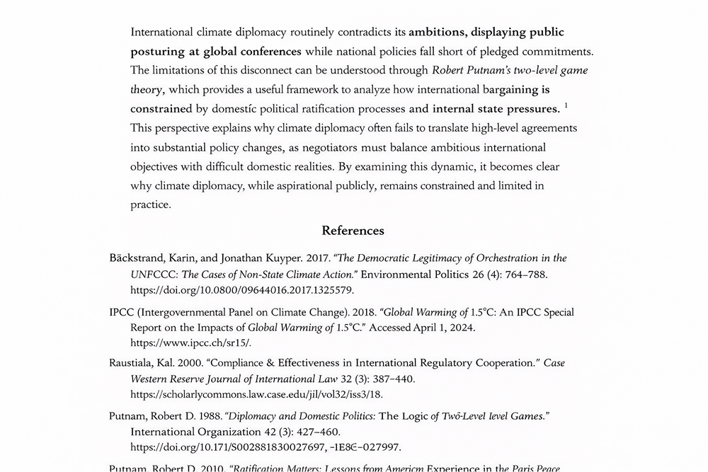 "Climate treaty compliance is an interesting problem because the failure mode is structural, not motivational. States often want to comply and simply lack domestic mechanisms to do so. I'll build the argument around that gap rather than framing this as bad faith diplomacy - unless you'd prefer otherwise."