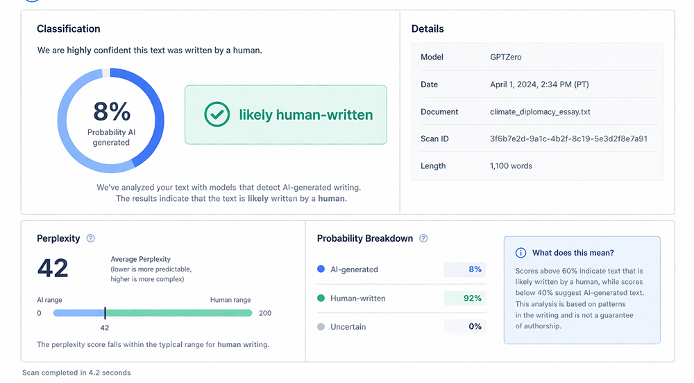 Yes, it can be fooled - and so can every AI detection tool currently available. What passing GPTZero indicates is that the writing patterns don't match common AI output signatures, not that the paper is definitively human-written. Detection tools are probabilistic, not forensic.
