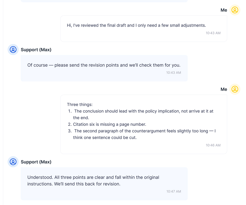 Post-delivery behavior is where services show their actual character. The revision request contained three specific items: